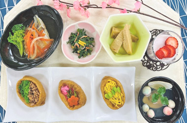 寒い冬を乗り越え、暖かい春の訪れを喜ぶような、彩り豊かなお料理に仕上げました。飾りいなりは、お弁当につめて、お花見に持って行くのにもいいですね。