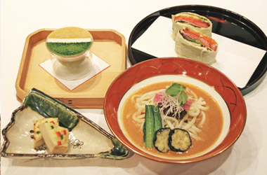 また、大豆肉や豆乳に比べてまだ馴染みの薄いライスミルクやソイヨーグルトなどのプラントベースフードの他、油揚げ、凍り豆腐、とろろ昆布など、日本の伝統的な加工食品も新たなアレンジをして取り入れました。